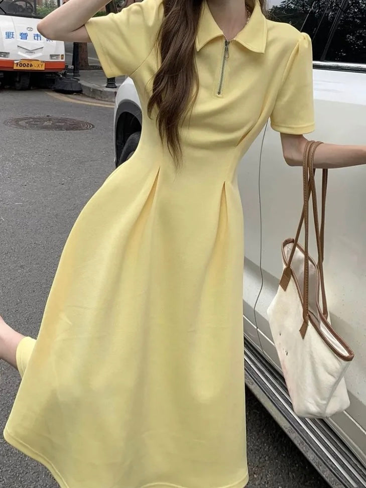 Soft and elegant pastel yellow A-line midi dress with modern zip collar detail. Designed in premium flat jersey fabric with a flattering flare for a fresh and effortless look.